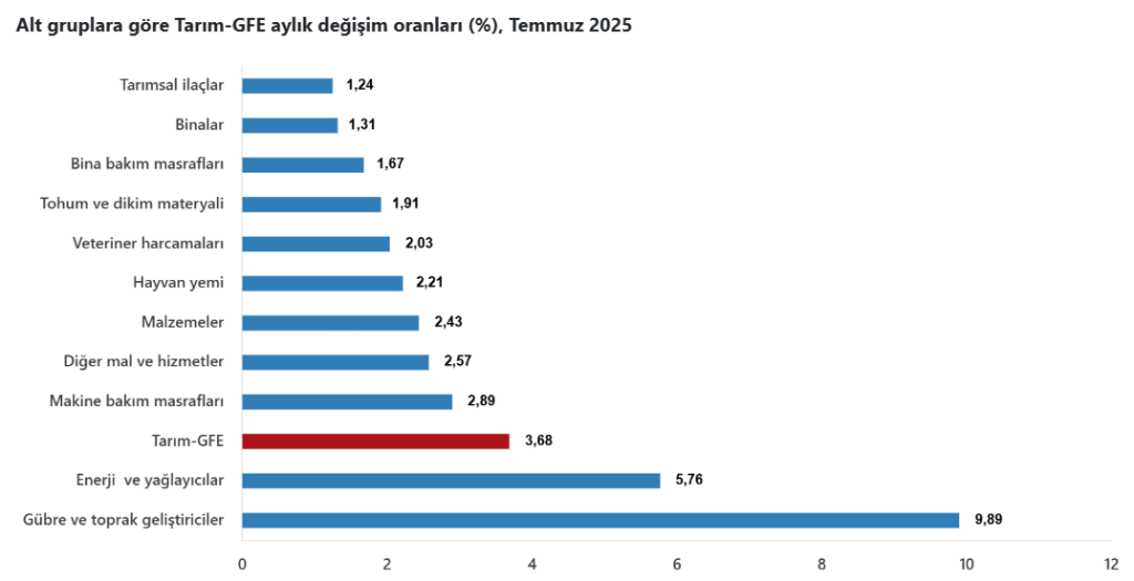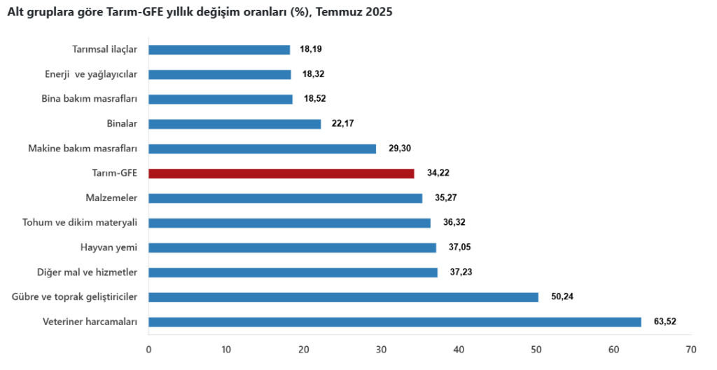 Türkiye İstatistik Kurumu (TÜİK) Temmuz 2025 itibarıyla Tarımsal Girdi Fiyat Endeksi (Tarım-GFE) verilerini açıkladı. Buna göre, Tarım GFE aylık olarak yüzde 3.68, yıllık bazda ise yüzde 34.22 arttı.