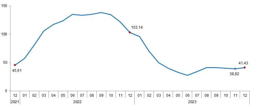 Tarım-GFE’de (2015=100), 2023 yılı Aralık ayında bir önceki aya göre %2,62, bir önceki yılın Aralık ayına göre %41,43, bir önceki yılın aynı ayına göre %41,43 ve on iki aylık ortalamalara göre %43,69 artış gerçekleşti.