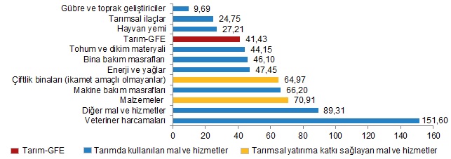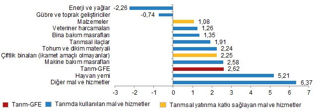 Bir önceki yılın aynı ayına göre artışın düşük olduğu alt gruplar %9,69 ile gübre ve toprak geliştiriciler ve %24,75 ile tarımsal ilaçlar oldu. Yıllık artışın yüksek olduğu alt gruplar ise sırasıyla, %151,60 ile veteriner harcamaları ve %89,31 ile diğer mal ve hizmetler oldu.