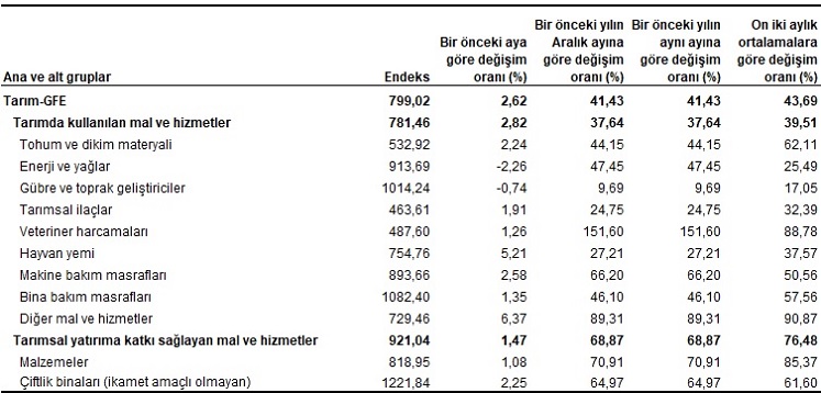 Ana gruplarda bir önceki aya göre, tarımda kullanılan mal ve hizmet endeksinde %2,82, tarımsal yatırıma katkı sağlayan mal ve hizmet endeksinde %1,47 artış gerçekleşti. Bir önceki yılın aynı ayına göre göre tarımda kullanılan mal ve hizmet endeksinde %37,64, tarımsal yatırıma katkı sağlayan mal ve hizmet endeksinde %68,87 artış gerçekleşti.