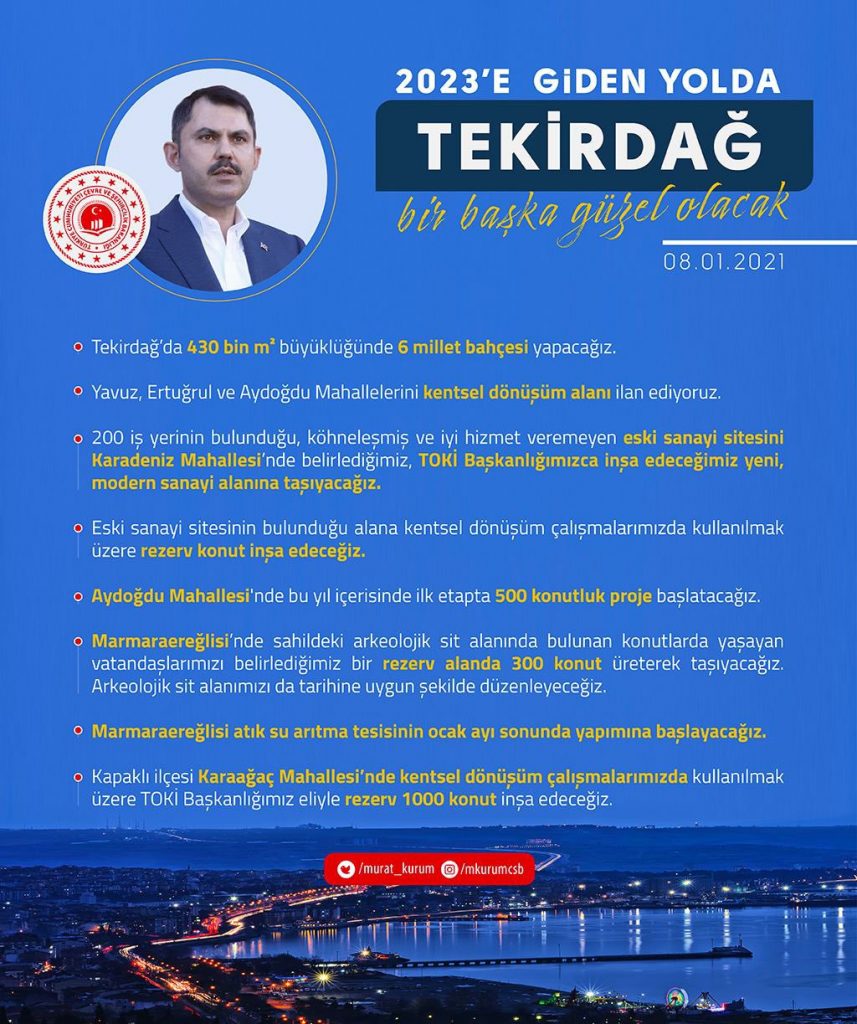 Bakan Kurum’un “Tekirdağ’daki tüm projelerimiz insan ve çevre odaklı olacak” başlığıyla paylaştığı mesajına göre önümüzdeki günlerde Tekirdağ’da hayata geçirilecek projeler şöyle: