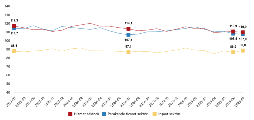 Mevsim etkilerinden arındırılmış güven endeksi Temmuz ayında bir önceki aya göre; hizmet sektöründe %0,8 oranında azalarak 110,0 değerini, perakende ticaret sektöründe %0,5 oranında azalarak 107,9 değerini ve inşaat sektöründe %2,2 oranında artarak 88,8 değerini aldı.