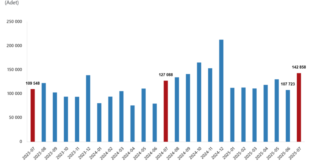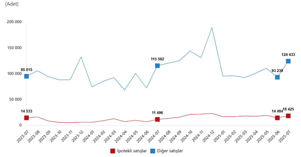 Türkiye İstatistik Kurumu (TÜİK) Temmuz 2025 itibarıyla Konut Satış İstatistiklerini açıkladı. Buna göre, geçen yılın aynı dönemine göre yüzde 12.4 artan konut satışları temmuzda 142 bin 858 adet olarak gerçekleşti.