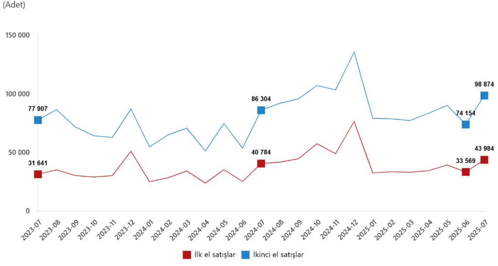 Türkiye genelinde ikinci el konut satış sayısı Temmuz ayında bir önceki yılın aynı ayına göre %14,6 oranında artarak 98 bin 874 oldu. Toplam konut satışları içinde ikinci el konut satışının payı %69,2 oldu. İkinci el konut satışları Ocak-Temmuz döneminde ise bir önceki yılın aynı dönemine göre %27,3 oranında artarak 583 bin 143 olarak gerçekleşti.