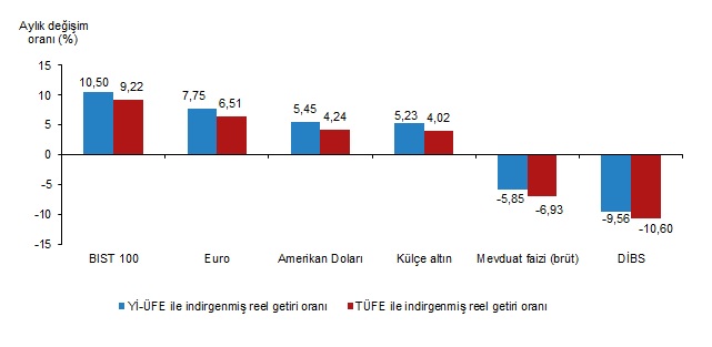 Yİ-ÜFE ile indirgendiğinde; yatırım araçlarından, Euro %7,75, Amerikan Doları %5,45 ve külçe altın %5,23 oranlarında yatırımcısına reel getiri sağlarken; mevduat faizi (brüt) %5,85 ve Devlet İç Borçlanma Senetleri (DİBS) %9,56 oranlarında yatırımcısına kaybettirdi. TÜFE ile indirgendiğinde; Euro %6,51, Amerikan Doları %4,24 ve külçe altın %4,02 oranlarında yatırımcısına reel getiri sağlarken; mevduat faizi (brüt) %6,93 ve DİBS %10,60 oranlarında yatırımcısına kaybettirdi.