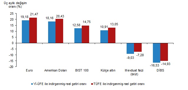 Euro, üç aylık değerlendirmede; Yİ-ÜFE ile indirgendiğinde %19,18, TÜFE ile indirgendiğinde ise %21,47 oranlarında yatırımcısına en yüksek reel getiri sağlayan yatırım aracı oldu. Aynı dönemde DİBS, Yİ-ÜFE ile indirgendiğinde %16,53, TÜFE ile indirgendiğinde ise %14,93 oranlarında yatırımcısına en çok kaybettiren yatırım aracı oldu.
