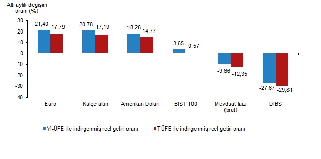 Altı aylık değerlendirmeye göre Euro; Yİ-ÜFE ile indirgendiğinde %21,40, TÜFE ile indirgendiğinde ise %17,79 oranlarında yatırımcısına en yüksek reel getiri sağlayan yatırım aracı olurken, aynı dönemde DİBS, Yİ-ÜFE ile indirgendiğinde %27,67, TÜFE ile indirgendiğinde ise %29,81 oranlarında yatırımcısına en çok kaybettiren yatırım aracı oldu.