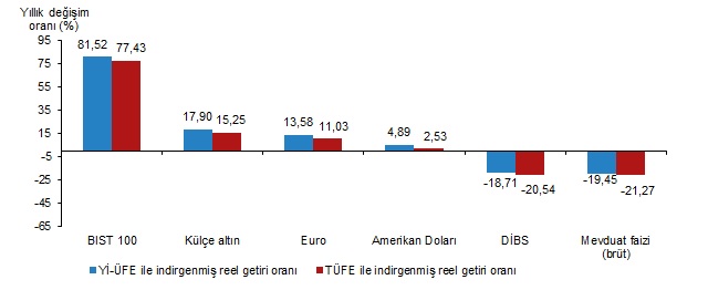 Finansal yatırım araçları yıllık olarak değerlendirildiğinde BIST 100 endeksi; Yİ-ÜFE ile indirgendiğinde %81,52,  TÜFE ile indirgendiğinde ise %77,43 oranlarında yatırımcısına en yüksek reel getiri sağlayan yatırım aracı oldu.