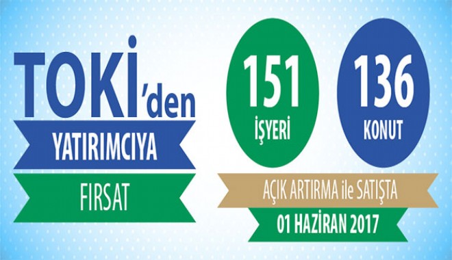 Başbakanlık Toplu Konut İdaresi – TOKi mülkiyetinde bulunan 12 şehirdeki 136 konut ile 13 şehirdeki 151 ticari ünite açık artırma yöntemiyle satışa çıkarılıyor. TURYAP tarafından düzenlenecek müzayede; 1 Haziranda eşzamanlı olarak biri Ankara'da diğeri de İstanbul'da bulunan 2 ayrı lokasyonda yapılacak.