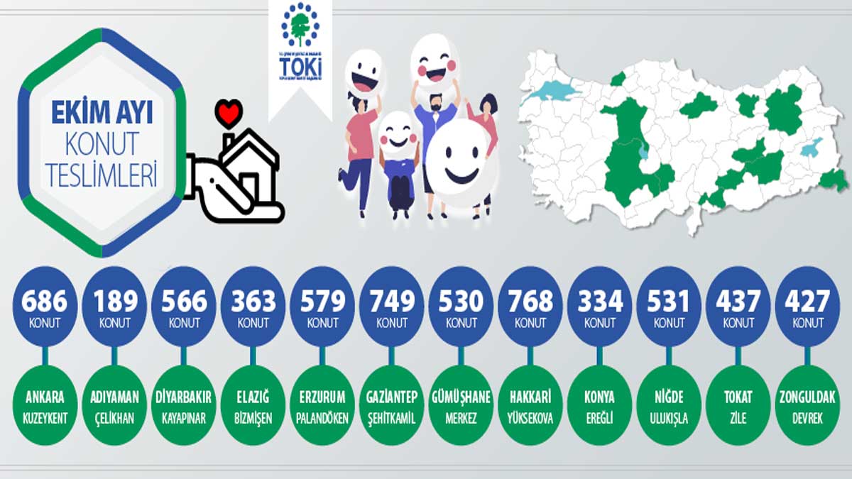 Kurum, ekim ayı içinde inşaatı tamamlanan 12 ildeki toplam 6 bin 159 konutu sahiplerine teslim etti.