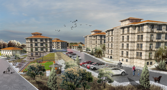 Yöresel ve yatay mimari tarzda inşa edilen projede yükseklikleri zemin+2 olan konutların 226’sı 2+1, 98’i ise 3+1 planında inşa edildi. Projede konutların yanı sıra ticaret merkezide bulunuyor.