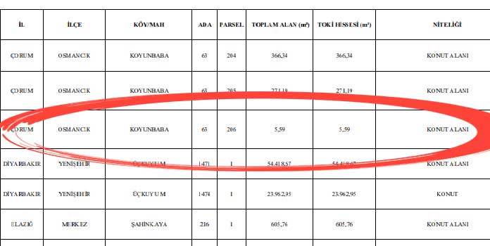 Toplu Konut İdaresinin açık artırmayla satışa sunduğu Amasya, Ankara, Antalya, Balıkesir, Bitlis, Çankırı, Çorum, Diyarbakır, Elazığ, Erzincan, Gümüşhane, Hatay, İstanbul, Karaman, Kırşehir, Kocaeli, Mardin, Mersin, Muğla, Şanlıurfa, Şırnak, Tekirdağ, Trabzon, Van, Yalova ve Yozgat şehirlerindeki toplam 87 arsanın 993 bin metrekarelik yüzölçümü ve 572 milyon liralık muhammen değeri bulunuyor.