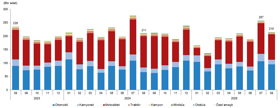 Türkiye İstatistik Kurumu (TÜİK) Ağustos 2025 itibarıyla Motorlu Kara Taşıtları istatistiklerini açıkladı. Buna göre, ağustos ayında 215 bin 130 adet taşıtın trafiğe kaydı yapılırken toplam kayıtlı satış sayısı 32 milyon 828 bin 821 oldu.