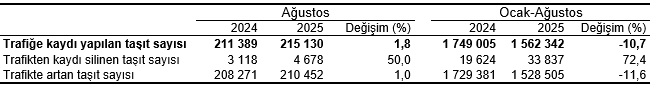 Ocak-Ağustos döneminde bir önceki yılın aynı dönemine göre trafiğe kaydı yapılan taşıt sayısı %10,7 azalarak 1 milyon 562 bin 342 adet olurken, trafikten kaydı silinen taşıt sayısı %72,4 artarak 33 bin 837 adet oldu. Böylece Ocak-Ağustos döneminde trafikteki toplam taşıt sayısında 1 milyon 528 bin 505 adet artış gerçekleşti.