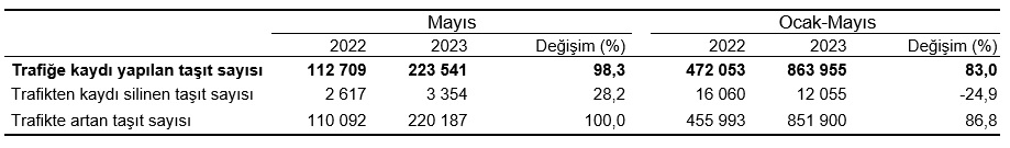 Ocak-Mayıs döneminde bir önceki yılın aynı dönemine göre trafiğe kaydı yapılan taşıt sayısı %83,0 artarak 863 bin 955 adet olurken, trafikten kaydı silinen taşıt sayısı %24,9 azalarak 12 bin 55 adet oldu. Böylece Ocak-Mayıs döneminde trafikteki toplam taşıt sayısında 851 bin 900 adet artış gerçekleşti.