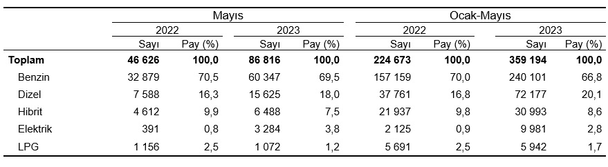 Ocak-Mayıs döneminde trafiğe kaydı yapılan 359 bin 194 adet otomobilin %66,8’i benzinli, %20,1’i dizel, %8,6’sı hibrit, %2,8’i elektrikli ve %1,7’si LPG’lidir. Mayıs ayı sonu itibarıyla trafiğe kayıtlı 14 milyon 630 bin 136 adet otomobilin ise %36,5’i dizel, %34,4’ü LPG’li, %27,6’sı benzinli, %1,1’i hibrit ve %0,2’si elektriklidir. Yakıt türü bilinmeyen(2) otomobillerin oranı ise %0,2’dir.