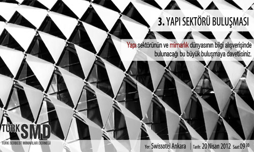 Türk Serbest Mimarlar Derneğinin (TSMD), mimarlık ve tasarımın yanı sıra ‘Yapı Sektörü’ ve ‘Kentsel Gelişim Politikaları’ üzerine de çeşitli sergi, konferans ve etkinlik düzenlemek ve ilgili sektörler arası bir iletişim noktası oluşturmak üzere kurmak üzere inşaatına başladığı Mimarlık Merkezi’ne finansal kaynak yaratmak için düzenlenen “TSMD ve Yapı Sektörü Buluşması”nın üçüncüsü 20 Nisan 2012 tarihinde Swissotel’de gerçekleştiriliyor.