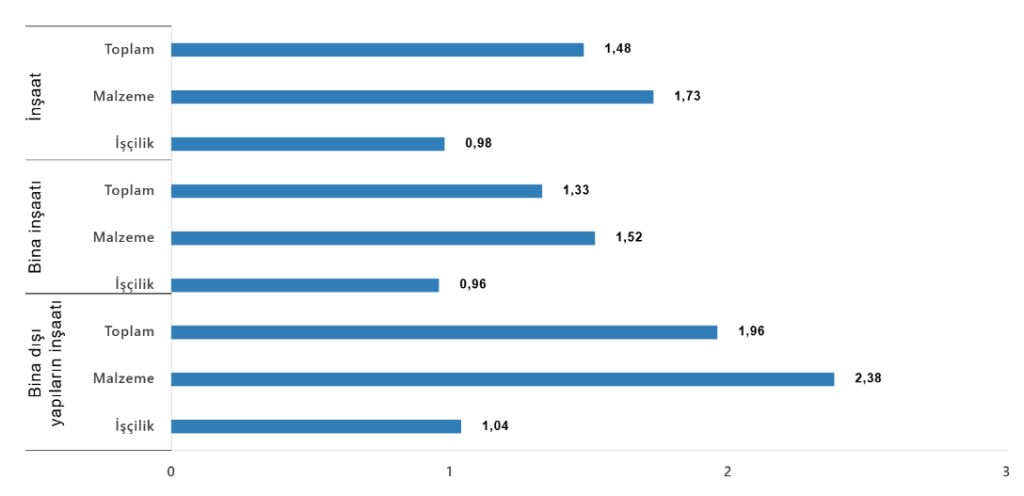Bina dışı yapılar için inşaat maliyet endeksi, bir önceki aya göre %1,96 arttı, bir önceki yılın aynı ayına göre %34,43 arttı. Bir önceki aya göre malzeme endeksi %2,38 arttı, işçilik endeksi %1,04 arttı. Ayrıca bir önceki yılın aynı ayına göre malzeme endeksi %25,85 arttı, işçilik endeksi %59,04 arttı.