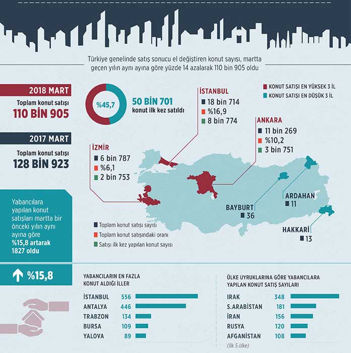 Türkiye İstatistik Kurumu resmi verilerine göre Türkiye genelinde konut satış adetleri şubat 2018’e göre yüzde 15.6 artışla ve geçen senenin mart ayına göre ise yüzde 14’lük düşüşle 110 bin 905 adet olarak gerçekleşti.