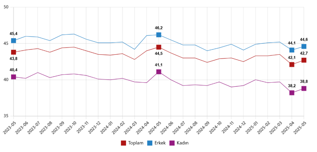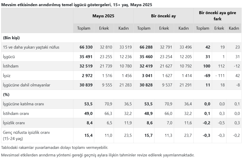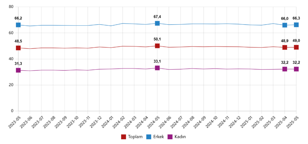 İşgücü 2025 yılı Mayıs ayında bir önceki aya göre 31 bin kişi artarak 35 milyon 491 bin kişi, işgücüne katılma oranı ise aynı seviyede kalarak %53,5 olarak gerçekleşti. İşgücüne katılma oranı erkeklerde %70,9 iken kadınlarda %36,5 oldu.