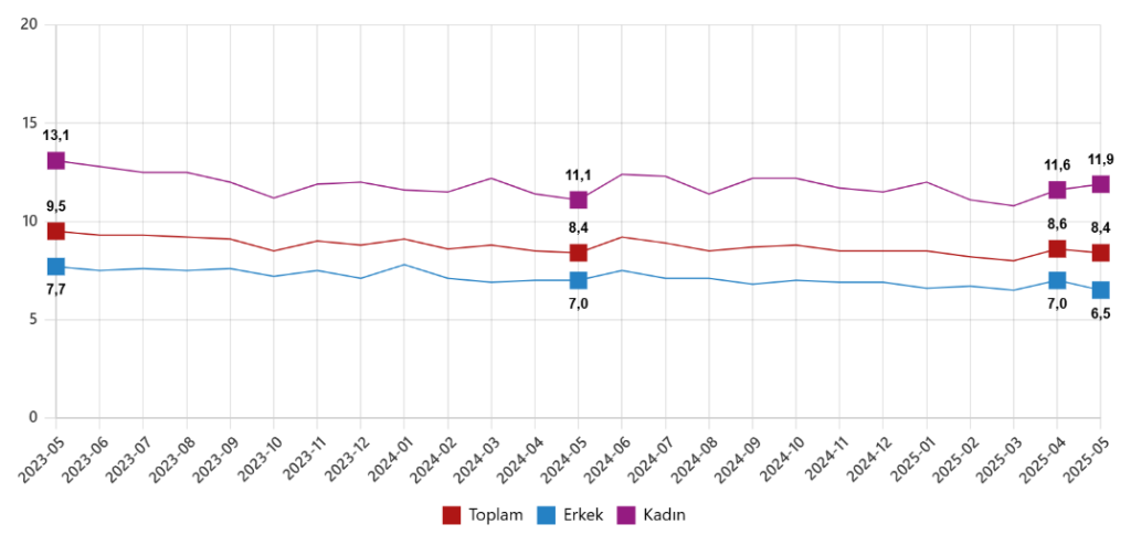 Hanehalkı İşgücü Araştırması sonuçlarına göre; 15 ve daha yukarı yaştaki kişilerde işsiz sayısı 2025 yılı Mayıs ayında bir önceki aya göre 69 bin kişi azalarak 2 milyon 972 bin kişi oldu. İşsizlik oranı ise 0,2 puan azalarak %8,4 seviyesinde gerçekleşti. İşsizlik oranı erkeklerde %6,5 iken kadınlarda %11,9 olarak tahmin edildi.