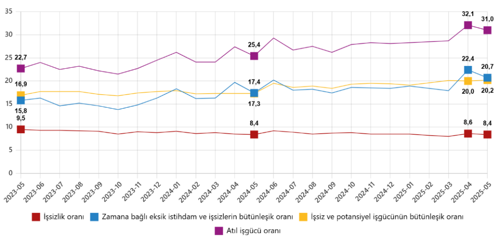 Zamana bağlı eksik istihdam, potansiyel işgücü ve işsizlerden oluşan atıl işgücü oranı 2025 yılı Mayıs ayında bir önceki aya göre 1,1 puan azalarak %31,0 oldu. Zamana bağlı eksik istihdam ve işsizlerin bütünleşik oranı %20,7 iken işsiz ve potansiyel işgücünün bütünleşik oranı %20,2 olarak tahmin edildi.