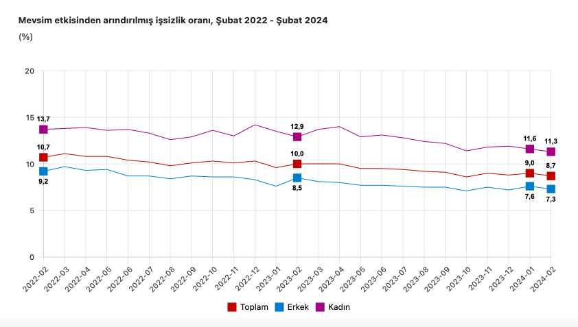 Hanehalkı İşgücü Araştırması sonuçlarına göre; 15 ve daha yukarı yaştaki kişilerde işsiz sayısı 2024 yılı Şubat ayında bir önceki aya göre 109 bin kişi azalarak 3 milyon 78 bin kişi oldu. İşsizlik oranı ise 0,3 puan azalarak %8,7 seviyesinde gerçekleşti. İşsizlik oranı erkeklerde %7,3 iken kadınlarda %11,3 olarak tahmin edildi.