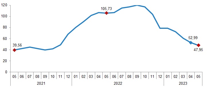 İnşaat maliyet endeksi, 2023 yılı Mayıs ayında bir önceki aya göre %0,54, bir önceki yılın aynı ayına göre %47,95 arttı. Bir önceki aya göre malzeme endeksi %0,28, işçilik endeksi %1,23 arttı. Ayrıca bir önceki yılın aynı ayına göre malzeme endeksi %33,55, işçilik endeksi %104,83 arttı.