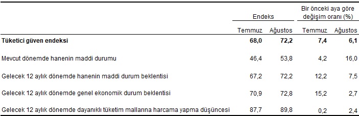 Türkiye İstatistik Kurumu ve Türkiye Cumhuriyet Merkez Bankası işbirliği ile yürütülen tüketici eğilim anketi sonuçlarından hesaplanan mevsim etkilerinden arındırılmış tüketici güven endeksi, Ağustos ayında bir önceki aya göre %6,1 oranında arttı; Temmuz ayında 68,0 olan endeks, Ağustos ayında 72,2 oldu.