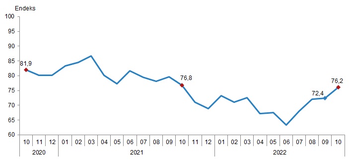 Türkiye İstatistik Kurumu (TÜİK), Ekim 2022 Tüketici Güven Endeksi’ni açıkladı. Buna göre Eylül ayında 72,4 olan endeks %5.3 oranında artarak 76,2 oldu.