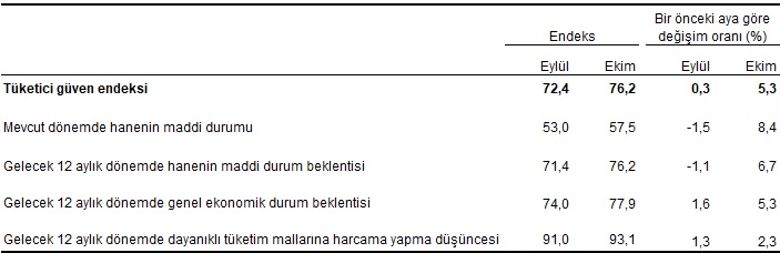 Türkiye İstatistik Kurumu ve Türkiye Cumhuriyet Merkez Bankası işbirliği ile yürütülen tüketici eğilim anketi sonuçlarından hesaplanan mevsim etkilerinden arındırılmış tüketici güven endeksi, Ekim ayında bir önceki aya göre %5,3 oranında arttı; Eylül ayında 72,4 olan endeks, Ekim ayında 76,2 oldu.