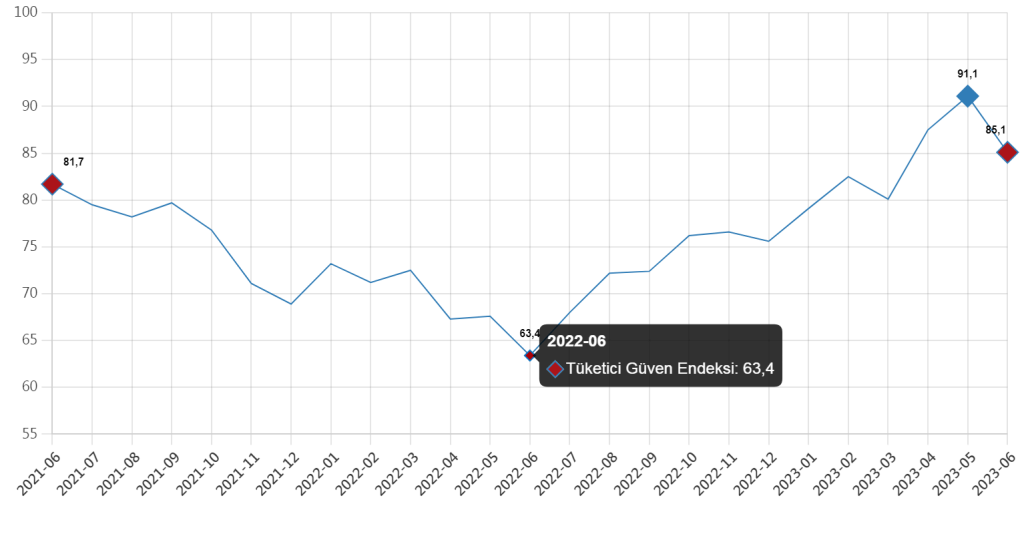 Türkiye İstatistik Kurumu (TÜİK) tarafından açıklanan Haziran 2023 Tüketici Güven Endeksi verisine göre, bir önceki aya göre yüzde 6.5 gerileyen endeks 85.1 puana indi.