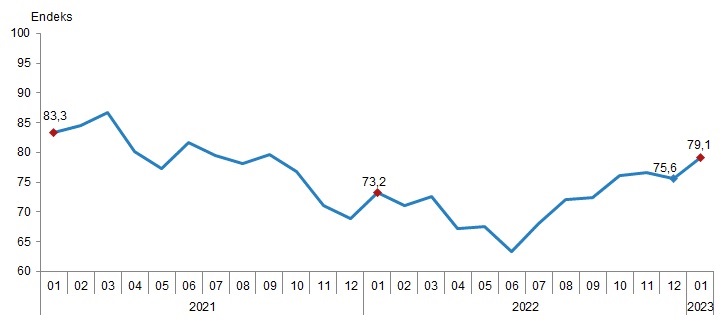 Türkiye İstatistik Kurumu (TÜİK), Tüketici Güven Endeksi Ocak 2023 verilerini yayınladı. Buna göre, aralık ayına göre yüzde 4.6 artan endeks puanı 79.1 olarak gerçekleşti.