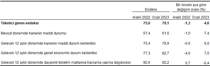 Tüketici güven endeksi, alt endeksleri ve değişim oranları, Ocak 2023