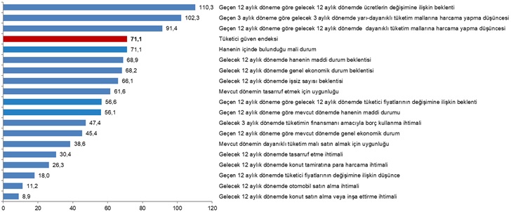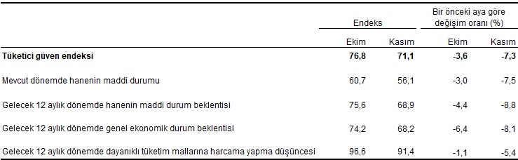 Türkiye İstatistik Kurumu ve Türkiye Cumhuriyet Merkez Bankası işbirliği ile yürütülen tüketici eğilim anketi sonuçlarından hesaplanan mevsim etkilerinden arındırılmış tüketici güven endeksi, Kasım ayında bir önceki aya göre %7,3 oranında azaldı; Ekim ayında 76,8 olan endeks, Kasım ayında 71,1 oldu.