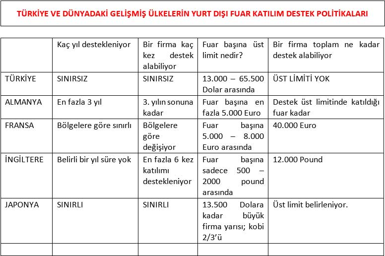 Türkiye ve dünyadaki gelişmiş ülkeler firmaları yurt dışında fuara katıldıklarında ne kadar destek alabiliyorlar konulu detaylarını aşağıda bulabilirsiniz.