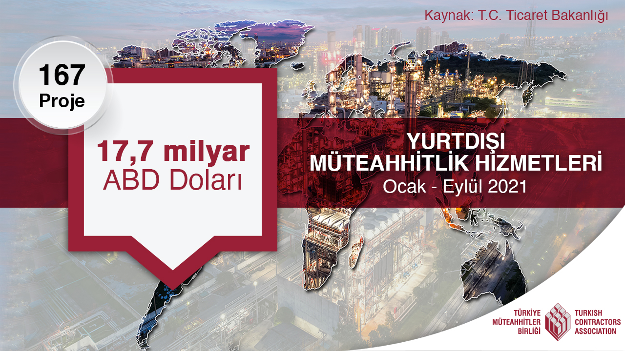 Ticaret Bakanlığı verilerine göre; Türk müteahhitlik şirketlerinin Ocak- Eylül 2021 dönemindeki 9 aylık süre zarfında yurt dışında üstlendikleri yeni proje sayısı 167 olurken bu işlerin parasal tutarı toplam 17.7 milyar ABD Doları oldu.