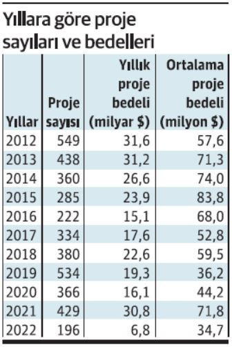 Sektörde, salgının etkisinin azalmasının ardından 2021’de 30 milyar doların üzerinde sözleşme imzalanarak önceki yıllar rekoruna ulaşılmıştı. Rusya-Ukrayna savaşının 2022’de toplam tutarı etkilemesi bekleniyor. Öte yandan yükselen petrol fiyatları nedeniyle gelecek dönemde geliri petrol ve doğalgaza dayalı ülkelerde yeni proje sayısında artış olabileceği ve orta-uzun vadede yeniden büyük oranlı yükselişlerin görülebileceği belirtiliyor. Türk müteahhitler yurt dışında en fazla konut, karayolu- tünel-köprü, enerji santralleri, ticaret merkezleri ve havalimanı inşa etti. Son yıllarda ise bunlara demiryolu, içmesuyu altyapı, arıtma tesisi gibi daha farklı alanlar da eklendi.