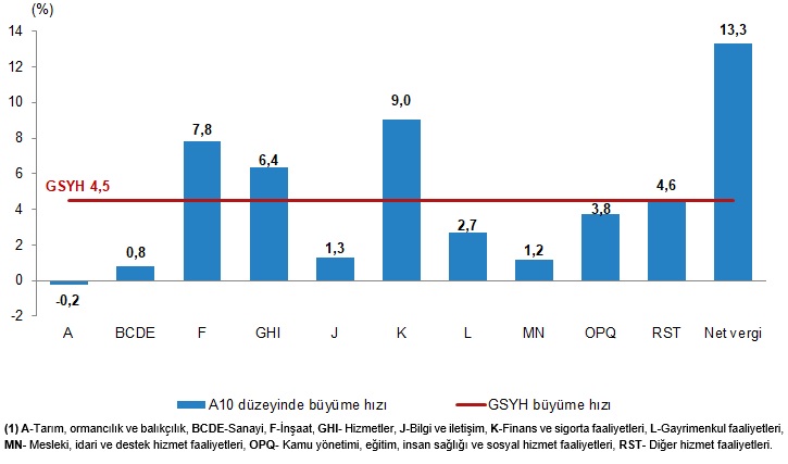 GSYH’yi oluşturan faaliyetler incelendiğinde; 2023 yılında bir önceki yıla göre zincirlenmiş hacim endeksi olarak; finans ve sigorta faaliyetleri toplam katma değeri %9,0, inşaat %7,8, hizmetler %6,4, diğer hizmet faaliyetleri %4,6, kamu yönetimi, eğitim, insan sağlığı ve sosyal hizmet faaliyetleri %3,8, gayrimenkul faaliyetleri %2,7, bilgi ve iletişim faaliyetleri %1,3, mesleki, idari ve destek hizmet faaliyetleri %1,2 ve sanayi %0,8 arttı. Tarım sektörü ise %0,2 azaldı.