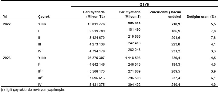 Üretim yöntemiyle Gayrisafi Yurt İçi Hasıla tahmini, 2023 yılının dördüncü çeyreğinde cari fiyatlarla bir önceki yılın aynı çeyreğine göre %75,9 artarak 8 trilyon 431 milyar 375 milyon TL oldu. GSYH’nin dördüncü çeyrek değeri cari fiyatlarla ABD doları bazında 304 milyar 402 milyon olarak gerçekleşti.