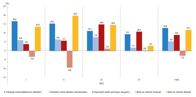 Yerleşik hanehalklarının nihai tüketim harcamaları 2023 yılının dördüncü çeyreğinde bir önceki yılın aynı çeyreğine göre zincirlenmiş hacim endeksi olarak %9,3 arttı. Devletin nihai tüketim harcamaları %1,7, gayrisafi sabit sermaye oluşumu ise  %10,7 arttı.