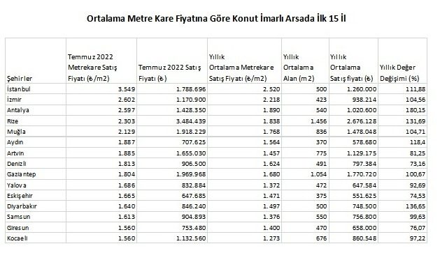 İstanbul’da konut imarlı arsalar için ortalama metrekare satış fiyatı 3549 TL, İzmir’de 2602 TL, Antalya 2597 TL, Rize’de 2303 TL ve Muğla 2129 TL olarak hesaplandı.