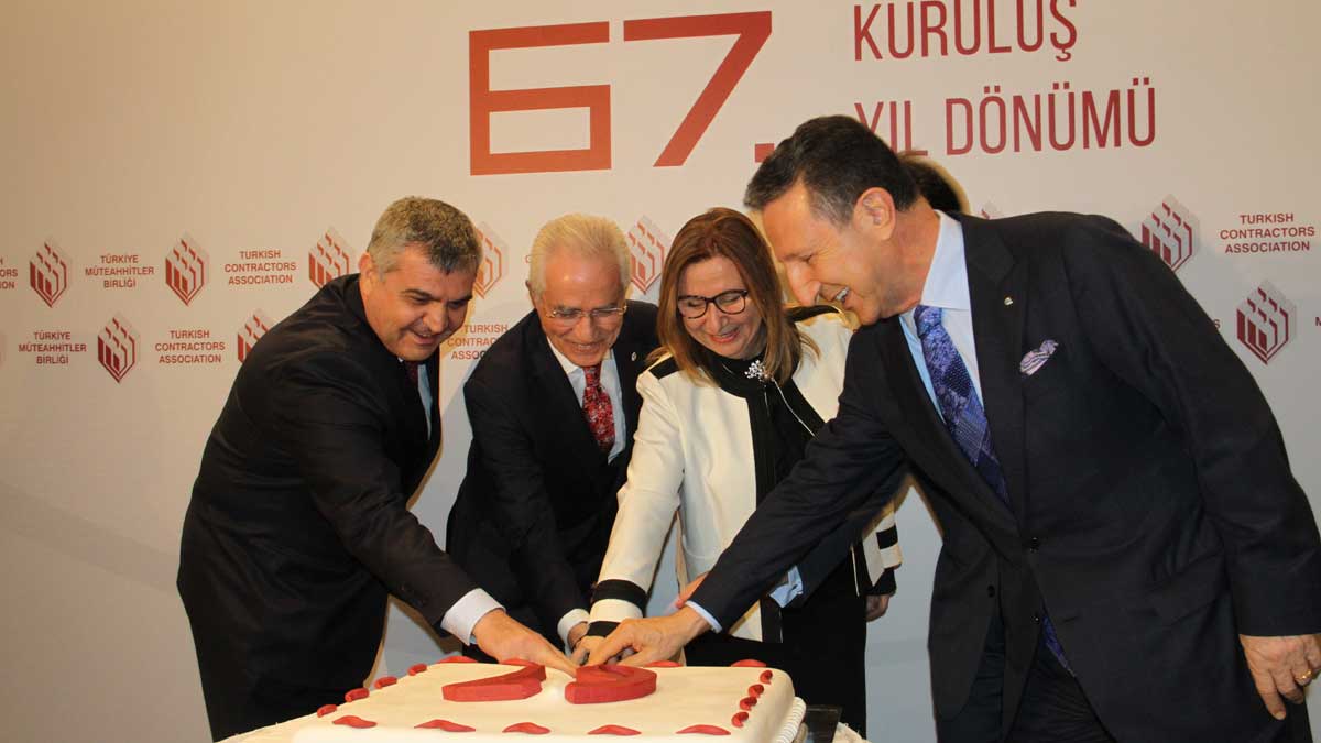 Türkiye Müteahhitler Birliği’nin uluslararası ödüllü özel binasında düzenlenen resepsiyonda, konuşmaların ardından 67’nci yıl pastası Ticaret Bakanı Ruhsar Pekcan, Tarım Bakanı Yardımcısı Akif Özkaldı, Dışişleri Bakan Yardımcısı Faruk Kaymakcı, TMB Başkanı Mithat Yenigün ve TMB Eski Başkanı Erdal Eren tarafından birlikte kesildi.