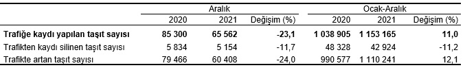 Trafiğe kaydı yapılan ve kaydı silinen motorlu kara taşıtları, Aralık 2021