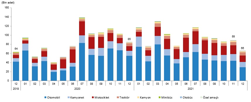 Aralık ayında trafiğe kaydı yapılan taşıt sayısı bir önceki aya göre özel amaçlı taşıtlarda %63,2 artarken otomobilde %32,6, motosiklette %26,7, kamyonette %22,2, otobüste %17,3, kamyonda %10,7, minibüste %6,0 ve traktörde %1,9 azaldı.