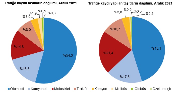 Aralık ayında trafiğe kaydı yapılan taşıtların %45,1’ini otomobil, %21,4’ünü motosiklet, %17,8’ini kamyonet, %10,7’sini traktör, %3,8’ini kamyon, %0,5’ini minibüs, %0,5’ini otobüs ve %0,2’sini özel amaçlı taşıtlar oluşturdu.