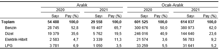 Trafiğe kaydı yapılan otomobillerin yakıt cinslerine göre dağılımı, Aralık 2021