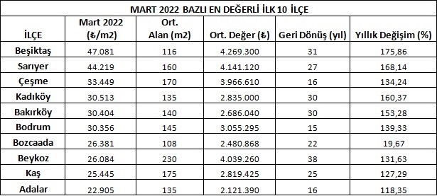 Endeksa.com’da yer alan mart 2022 verilerine göre, gayrimenkulde Türkiye’nin en değerli ilk 10 ilçesi belirlendi. Buna göre; konutlarda ortalama 47.081 TL/metrekare fiyatıyla İstanbul’un Beşiktaş ilçesi ilk sırada yer alırken bu ilçeyi ortalama 44.219 TL/metrekare fiyatı ile Sarıyer ve ortalama 33.449 TL/metrekare fiyatıyla Çeşme takip etti.