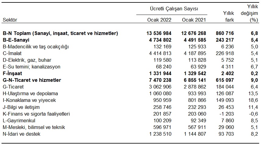 Sanayi, inşaat ve ticaret-hizmet sektörleri toplamında ücretli çalışan sayısı 2022 Ocak ayında bir önceki yılın aynı ayına göre %6,8 arttı. Ücretli çalışan sayısı bir önceki yılın aynı ayında 12 milyon 676 bin 268 kişi iken, 2022 yılı Ocak ayında 13 milyon 536 bin 984 kişi oldu.