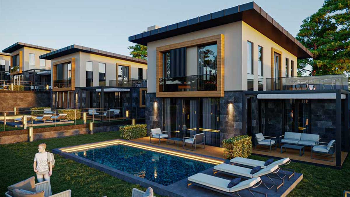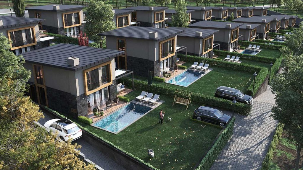 Villaların 650 metrekareye varan geniş bahçeleri, her villanın bahçesinde özel yüzme havuzu ve barbeküsü ile salonunda şöminesi bulunuyor.